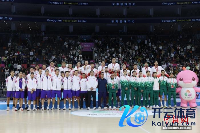 11月12日晚,第十五届世界畅通会篮球神气男人成年组金牌赛在东莞篮球中心举行,广东队101比65礼服浙江队夺得金牌。图为授奖庆典后,广东队、香港队、澳门队合影。中新社记者 盛佳鹏 摄