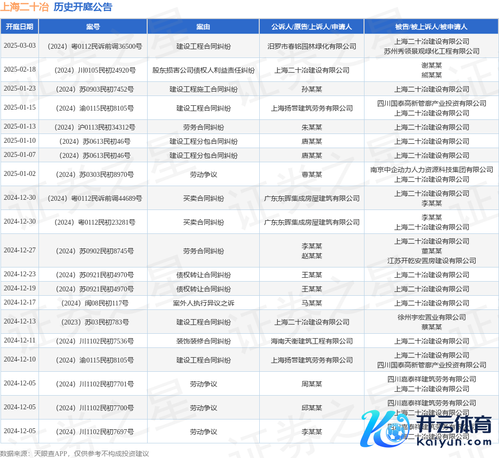 案号:(2024)苏0613民初46号审理法院:海门市东说念主民法院案由:建造工程分包条约纠纷当事东说念主信息: 原告/上诉东说念主:唐某某 被告/被上诉东说念主:上海二十冶建造有限公司开庭日历:2025年1月7日阐明统计,近一年内以上海二十冶建造有限公司为当事东说念主的历史开庭公告有136则,其中案由为“建造工程施工条约纠纷”的公告以43则居首,其次为“建造工程条约纠纷”有15则,“劳务条约纠纷”有12则。历史开庭公告(前20条)如下: