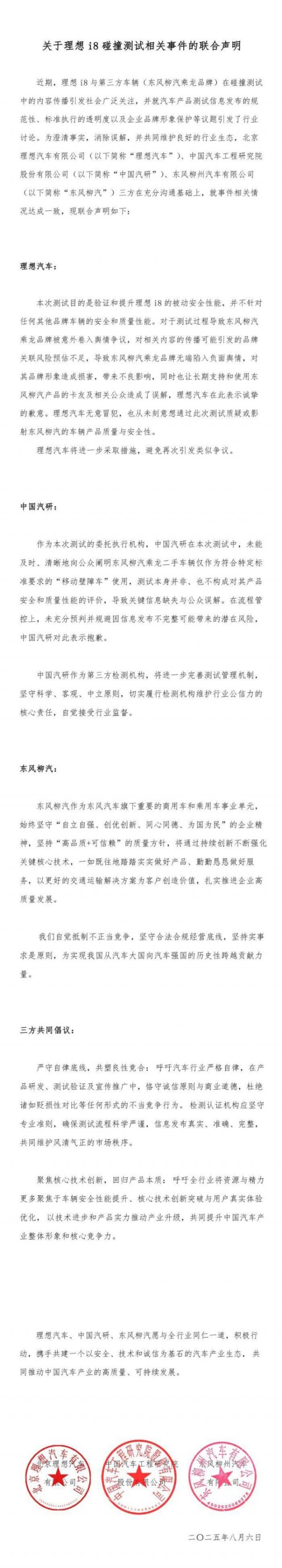 8 月 6 日,理念念汽车、中国汽研、东风柳汽就理念念 i8 碰撞测试相职业件发布荟萃声明。