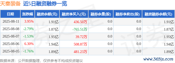 天秦装备融资融券信息袒露,融资方面,当日融资买入4364.17万元,融资偿还3927.67万元,融资净买入436.5万元。融券方面,融券卖出0.0股,融券偿还0.0股,融券余量0.0股,融券余额0.0万元。融资融券余额1.91亿元。
