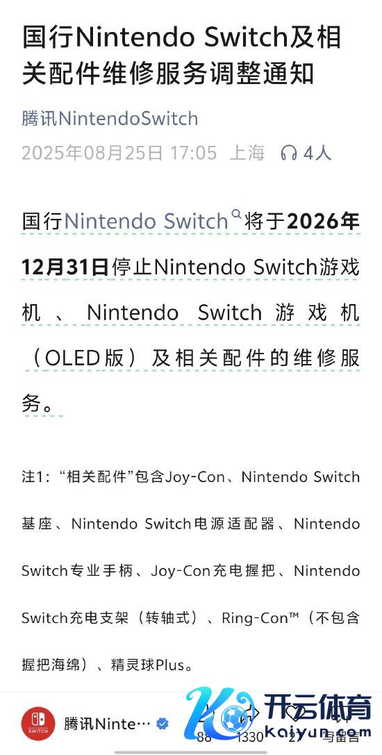 新浪科技讯 8月25日下昼音问,腾讯Nintendo Switch官方账号发布音问流露,国行Nintendo Switch将于2026年12月31日住手Nintendo Switch游戏机、Nintendo Switch游戏机(OLED版)及酌量配件的维修就业。