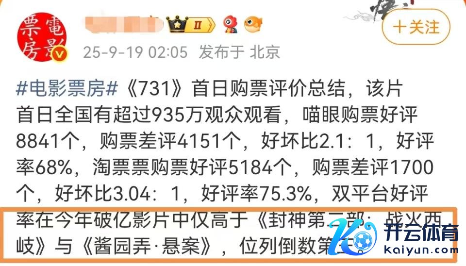 阐明《731》首日购票评价回首,该片首日宇宙有跨越935万不雅众不雅看,双平台好评率在本年破亿影片中仅高于乌尔善的《封神第二部》与陈可辛的《酱园弄悬案》,位列倒数第三。